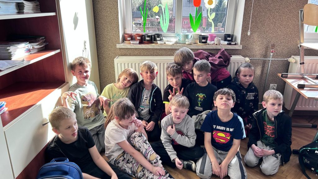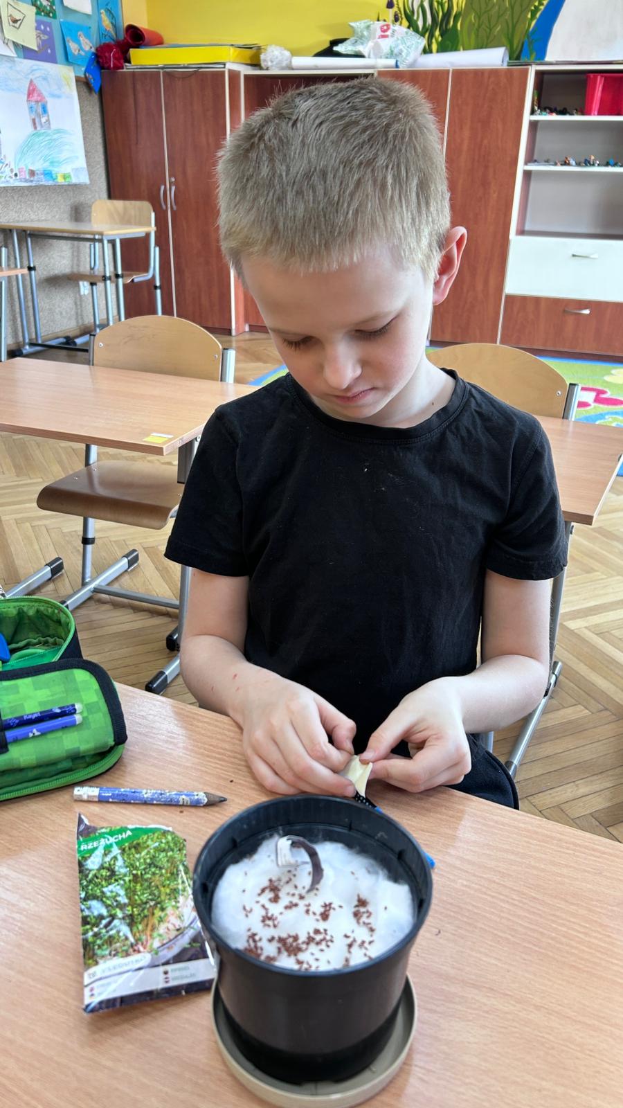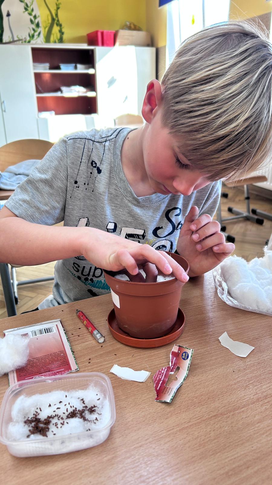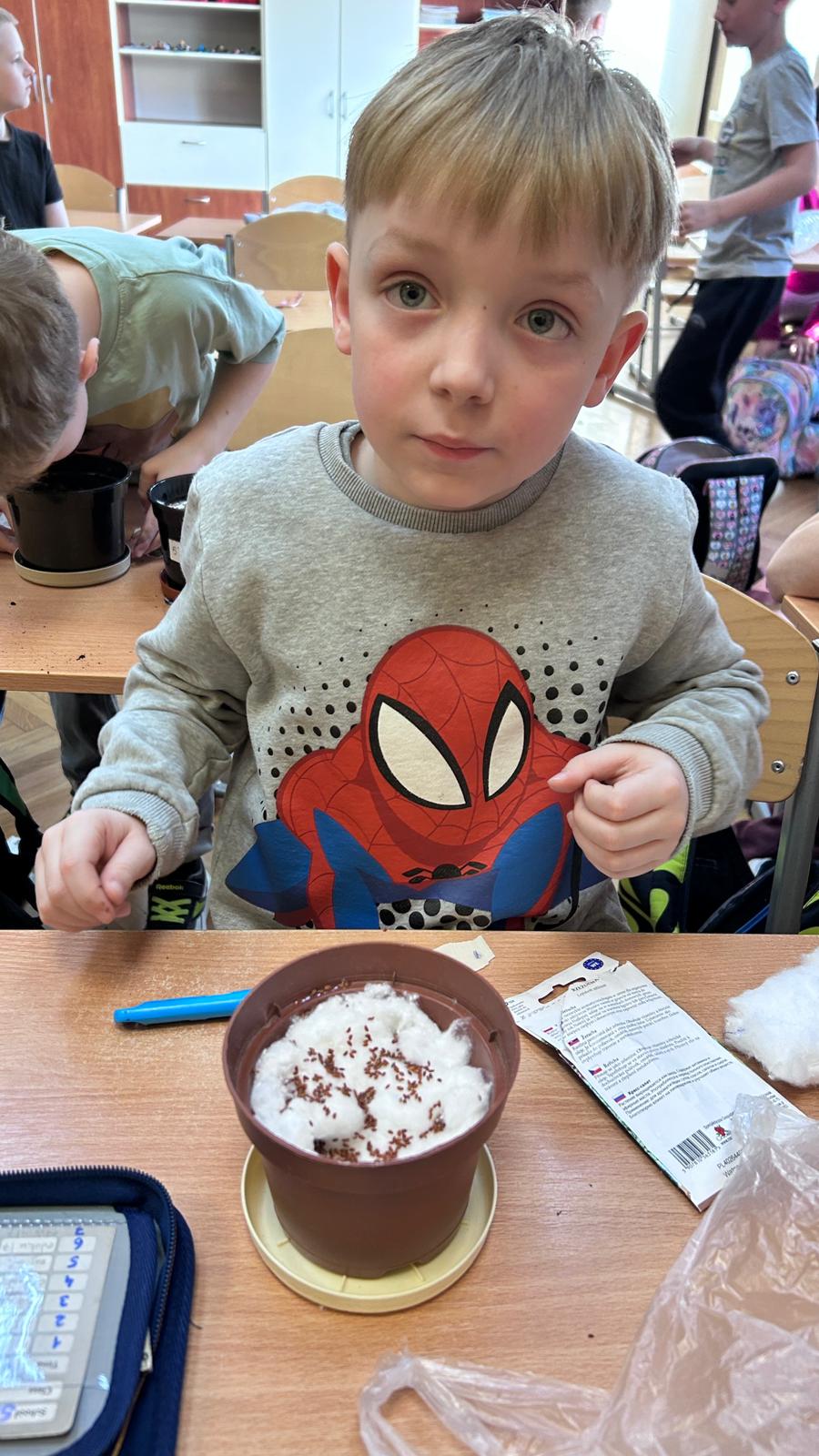 Uczniowie klasy 1b zamienili się w małych ogrodników! Podczas zajęć założyli własne hodowle rzeżuchy. Dzieci z ogromnym zaangażowaniem wysiewały nasionka, podlewały je i uczyły się, czego rośliny potrzebują do wzrostu.