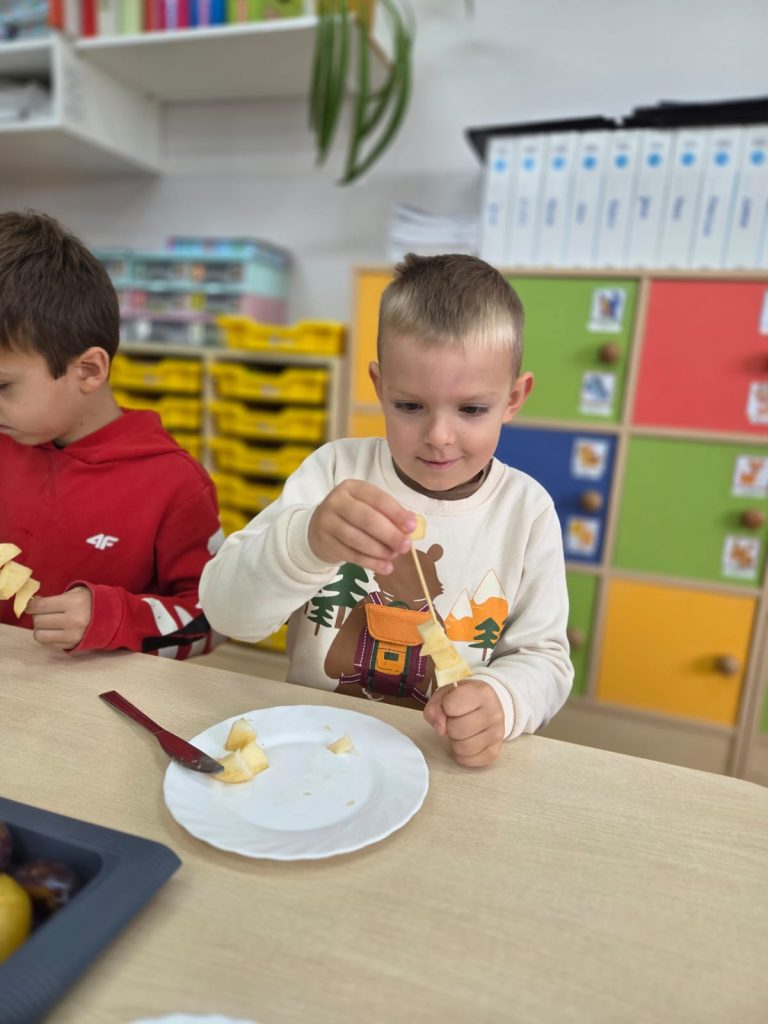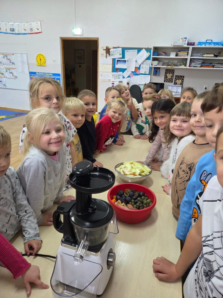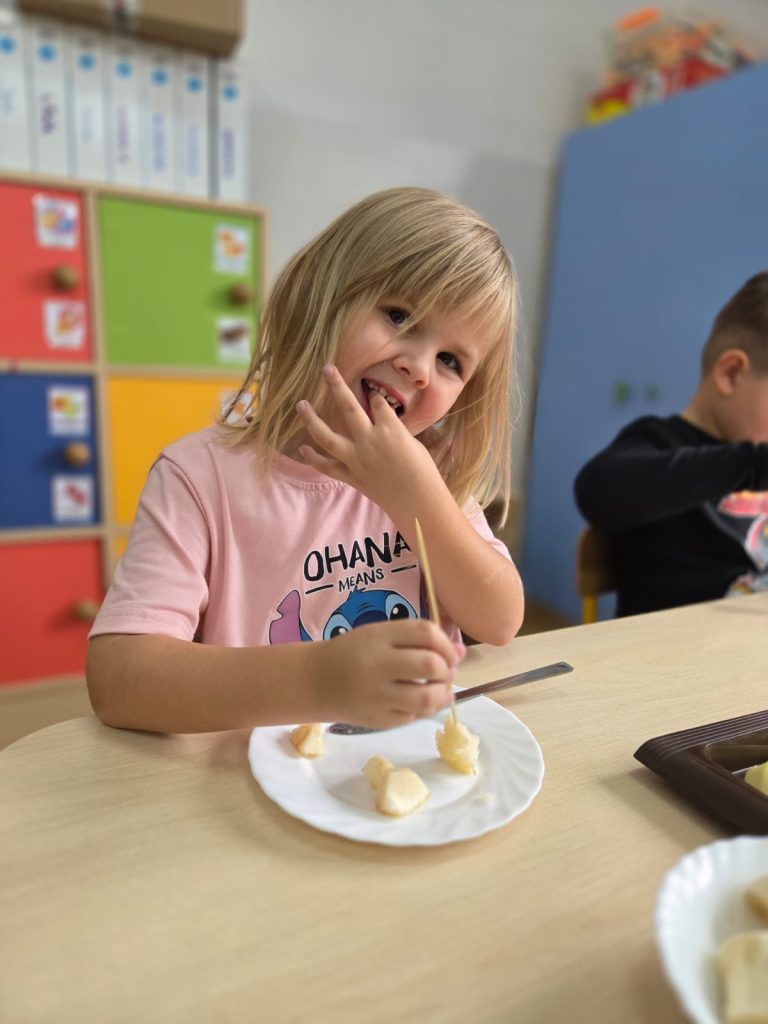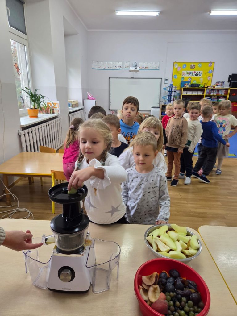 Nie zabrakło również kulinarnych doświadczeń. Przedszkolaki przygotowywały sok owocowy, tworzyły owocowe szaszłyki, a na zakończenie degustowały różne owoce.