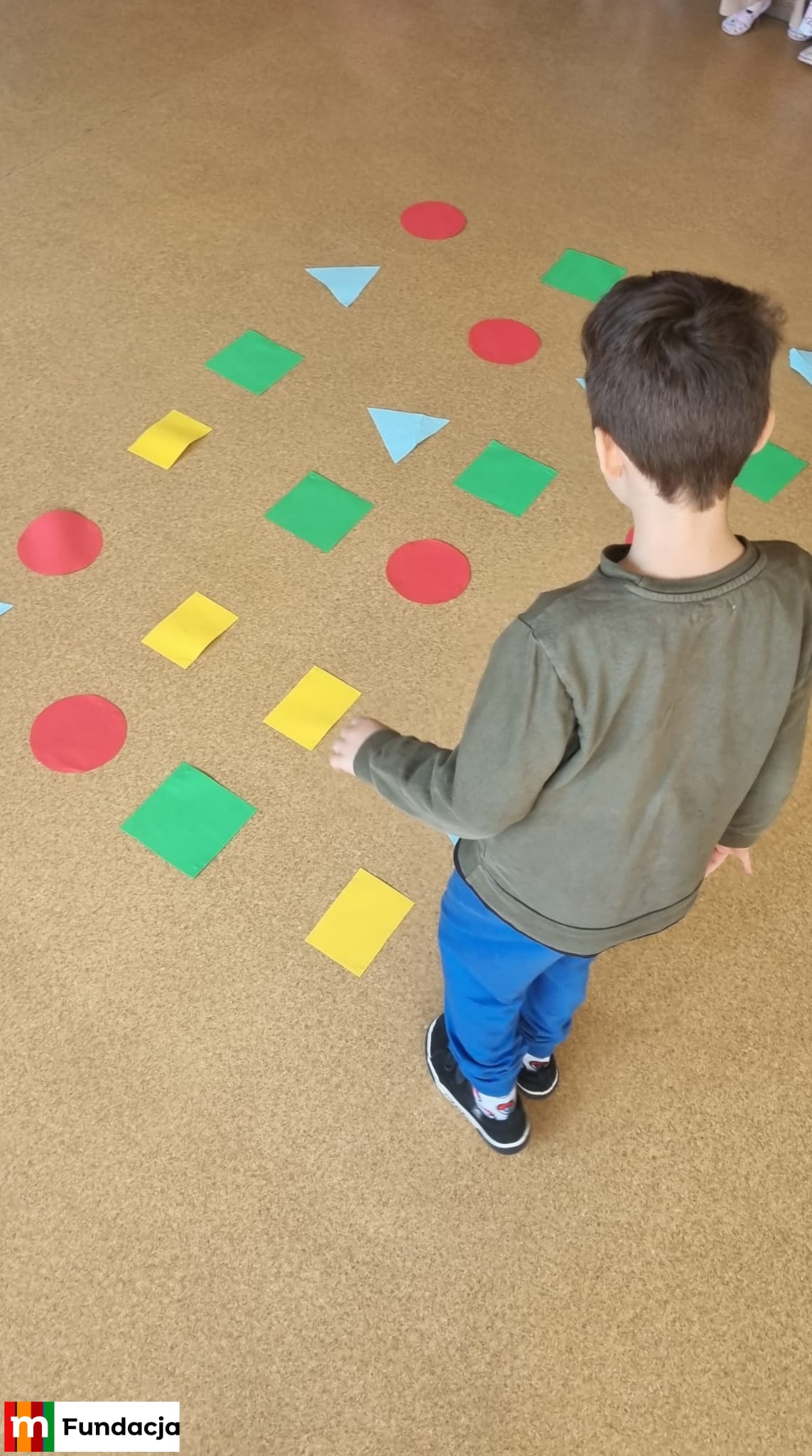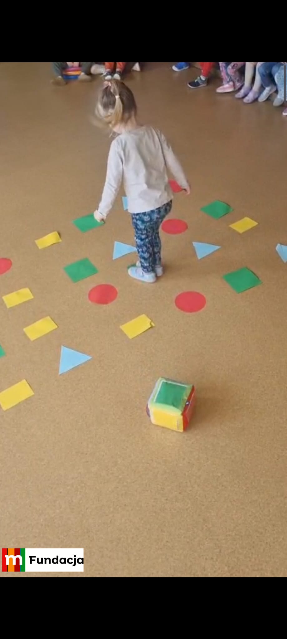 – rozpoznawały figury geometryczne – koło, trójkąt, kwadrat i prostokąt, utrwalając je w ruchowej zabawie skocznej połączonej z kolorami,