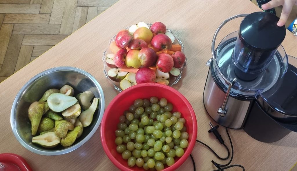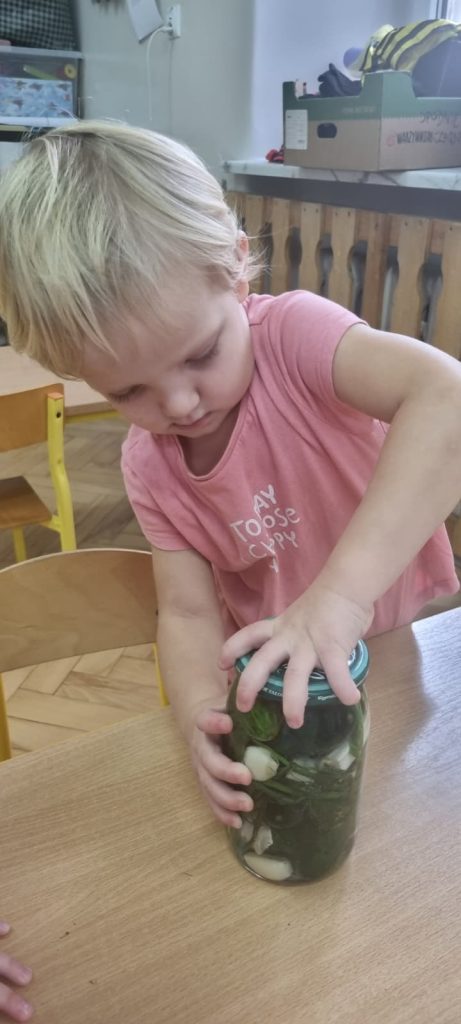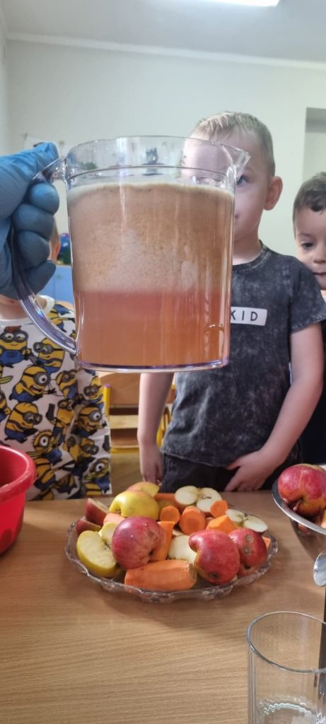 W ubiegłym tygodniu nasze Biedronki zamieniły się w małych kucharzy i odkrywców smaków! Dzieci poznawały owoce i warzywa, dowiedziały się, jak powstają różne przetwory, a następnie same spróbowały swoich sił w kuchni. Wspólnie przygotowaliśmy pyszny sok owocowy oraz ogórki kiszone, które z pewnością wyjdą znakomicie!